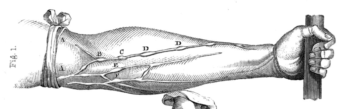 His next demonstration went further. He invited on stage a large man with muscular forearms and generous veins. Harvey tied a tourniquet around the man’s upper arm, causing his veins to bulge out even more dramatically (you can see this in your own arm, if you ever have your blood drawn at the doctor’s). First, Harvey asked the audience to observe that the veins were not uniform: there were irregular swellings along their length. Valves, he argued. The swellings had been observed and described by Hippocrates, among others, but their function was unknown in 1616.