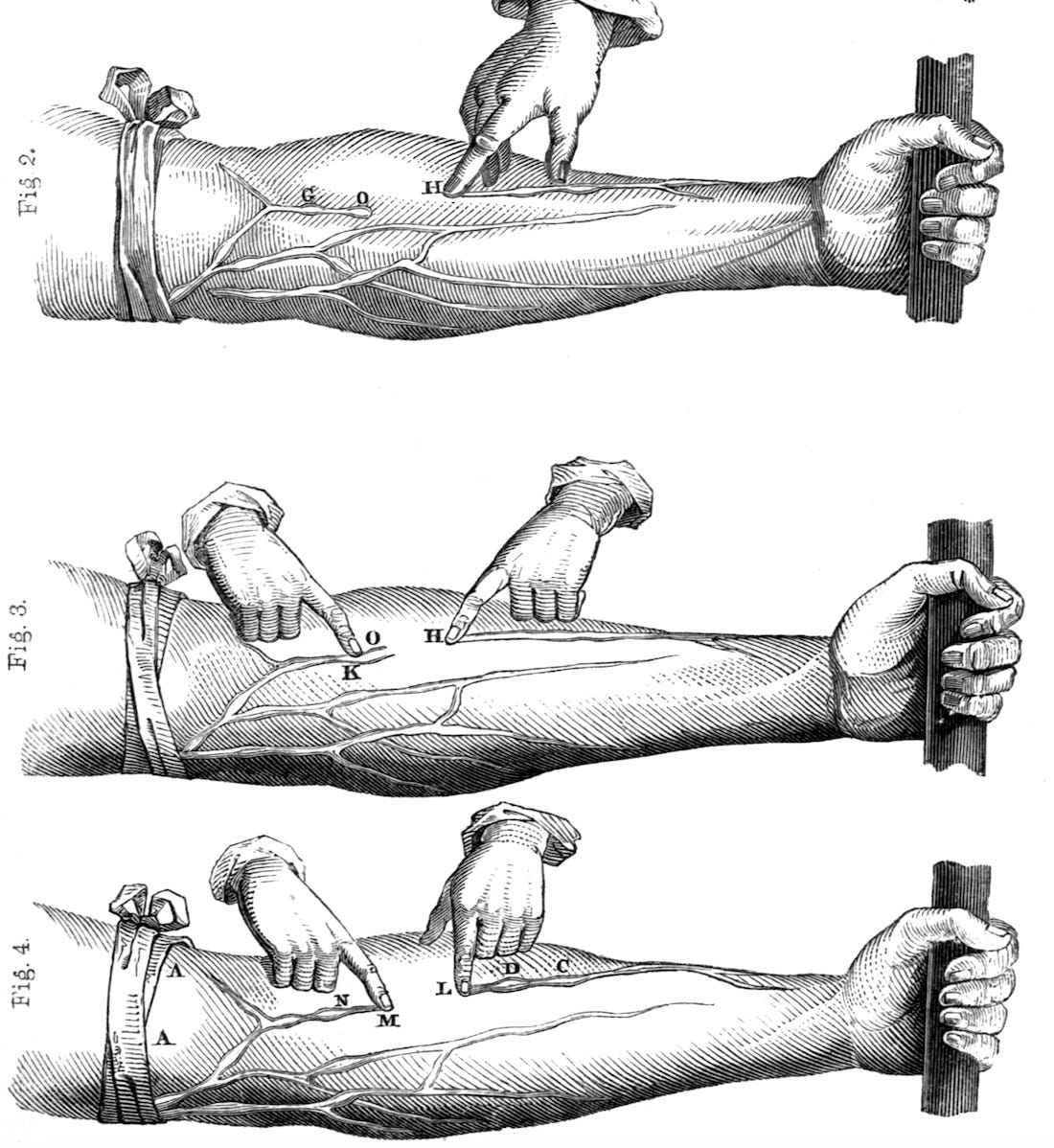 Next, Harvey used his finger to gently compress one of the veins in the middle of the man’s forearm. When he pushed gently, the vein disappeared between the place of obstruction and the next valve as though emptied of blood. He then used another finger to coax the blood out of the vein and down towards the hand. He was able to “milk” the vein in this way and compress it, collapsing the vein all the way down to the hand. According to the pneumatic theory, the hand was the blood’s final destination. If blood flows in a one-way circuit, he had simply sped up its journey. But when he released his finger, a startling revelation occurred: the blood rushed back into the vein, filling upwards from the hand and towards the tourniquet! The blood flowed through the vein TOWARDS the heart!